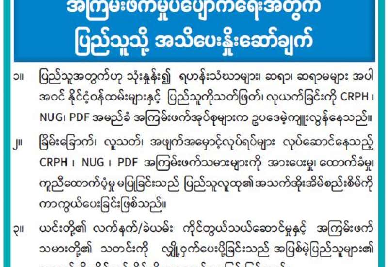 အကြမ်းဖက်အုပ်စုအဖြစ်ကြေညာထားသော CRPH၊ NUG နှင့် ယင်းတို့၏ လက်အောက်ခံ အဖွဲ့အစည်းများ၊ ယင်းတို့နှင့်ဆက်နွှယ်နေသော အဖွဲ့အစည်းများ၊ လူပုဂ္ဂိုလ်များသည် နိုင်ငံတော်တည်ငြိမ်အေးချမ်းရေးကို ပျက်ပြားစေရန်နှင့် ပြည်သူလူထုကို အကြောက်တရားများဖြစ်ပေါ်စေပြီး အစိုးရယန္တရားများပျက်ပြားစေရန် ရည်ရွယ်လျက် လှုံ့ဆော်ခြင်း၊ ဝါဒဖြန့်ခြင်း၊ ခြိမ်းခြောက်ခြင်းများကို လူမှုကွန်ရက်များမှတစ်ဆင့် နည်းမျိုးစုံဖြင့် ပြုလုပ်လျက်ရှိပါသည်။