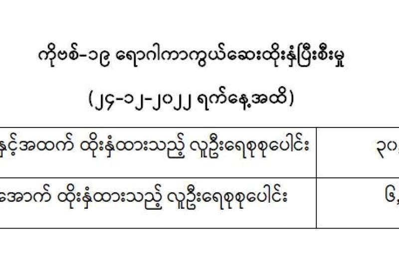 ကျန်းမာရေးဝန်ကြီးဌာနသည် COVID-19 သံသယလူနာများ၊ ဓာတ်ခွဲအတည်ပြုလူနာနှင့် အနီးကပ်ထိတွေ့ခဲ့သူများနှင့် အသွားအလာကန့်သတ် ထားရှိသူများအား COVID-19 ရောဂါ ရှိ၊ မရှိ ဓာတ်ခွဲစစ်ဆေးခြင်း ပုံမှန်ဆောင်ရွက်လျက်ရှိပြီး (၂၄-၁၂-၂၀၂၂) ရက်နေ့၊ ည (၈:၀၀) နာရီမှ (၂၅-၁၂-၂၀၂၂) ရက်နေ့၊ ည (၈:၀၀) နာရီအတွင်း ဓာတ်ခွဲနမူနာစုစုပေါင်း (၃,၃၆၉) ခုအား စစ်ဆေးပြီးစီးခဲ့ရာ COVID-19 ရောဂါ ဓာတ်ခွဲအတည်ပြုလူနာသစ် (၅) ဦး တွေ့ရှိရသဖြင့် ရောဂါပိုးတွေ့ရှိမှု ရာခိုင်နှုန်းမှာ (၀.၁၅) ရာခိုင်နှုန်း ရှိပါသည်။