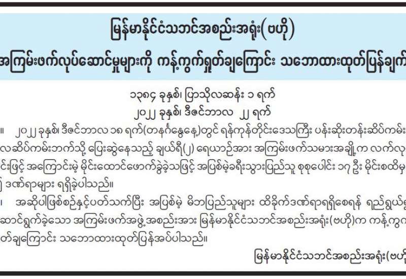 မြန်မာနိုင်ငံသဘင်အစည်းအရုံး(ဗဟို) အကြမ်းဖက်လုပ်ဆောင်မှုများကို ကန့်ကွက်ရှုတ်ချကြောင်း သဘောထားထုတ်ပြန်ချက်