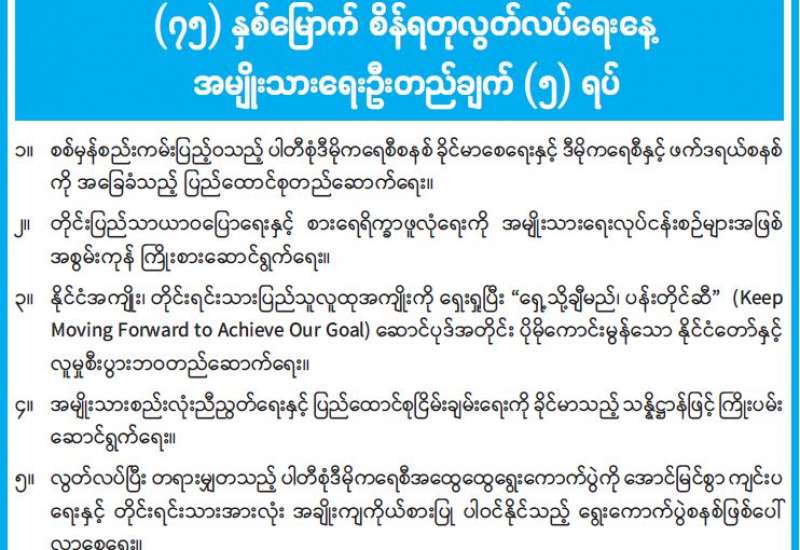 အမေရိကန်ပြည်ထောင်စု၊ နယူးယောက်မြို့၌ ၂၁-၁၂-၂၀၂၂ ရက်တွင်ကျင်းပခဲ့သည့် ကုလသမဂ္ဂလုံခြုံရေးကောင်စီအစည်းအဝေး၌ မြန်မာနိုင်ငံဆိုင်ရာလုံခြုံရေးကောင်စီ၏ ဆုံးဖြတ်ချက်အဆိုတစ်ရပ်ကို မဲခွဲချမှတ်ခဲ့ကြောင်း သိရှိရသည်။ ကုလသမဂ္ဂပဋိညာဉ်စာတမ်းတွင် နိုင်ငံတကာငြိမ်းချမ်းရေးနှင့် လုံခြုံရေးထိန်းသိမ်းရေးကို အဓိကတာဝန်ယူဆောင်ရွက်ရန် ကုလသမဂ္ဂအဖွဲ့ဝင်နိုင်ငံများက လုံခြုံရေးကောင်စီသို့ တာဝန်အပ်နှင်းထားသည်။ မြန်မာနိုင်ငံ၏အခြေအနေသည် နိုင်ငံတကာငြိမ်းချမ်းရေးနှင့် လုံခြုံရေးအပေါ်ထိခိုက်သက်ရောက်မှုမရှိဘဲ ပြည်တွင်းရေးသာဖြစ်သည်။ သို့ဖြစ်ရာ လုံခြုံရေးကောင်စီက ယခုကဲ့သို့ဆုံးဖြတ်ချက်အဆိုကို အတည်ပြုချမှတ်ခဲ့ခြင်းမှာ ကုလသမဂ္ဂ ပဋိညာဉ်စာတမ်းနှင့် ညီညွတ်ခြင်းမရှိကြောင်း အလေးထားဖော်ပြအပ်သည်။