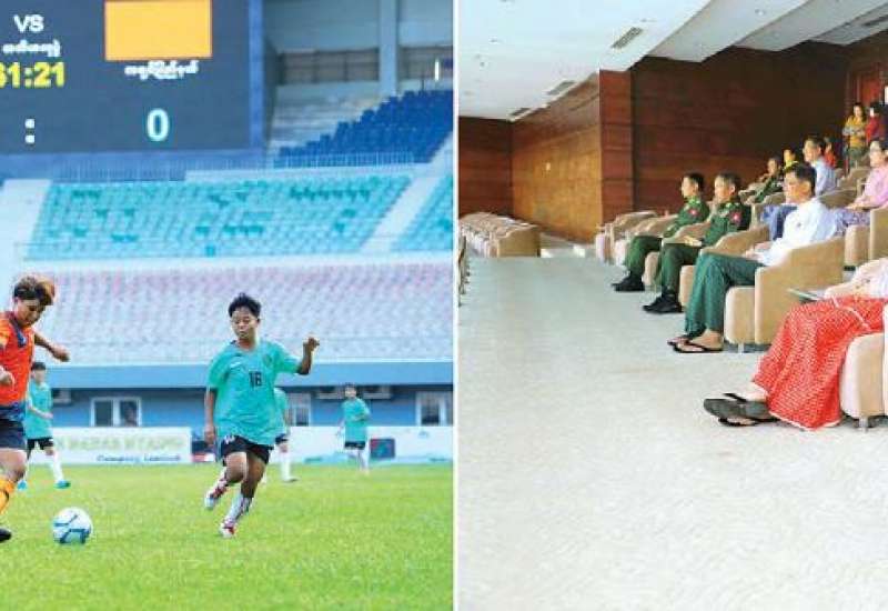 ၂၀၂၃ ခုနှစ် (၇၅)နှစ်မြောက် စိန်ရတုလွတ်လပ်ရေးနေ့အထိမ်းအမှတ် နိုင်ငံတော်စီမံအုပ်ချုပ်ရေးကောင်စီဥက္ကဋ္ဌဖလား ပြည်နယ်နှင့်တိုင်းဒေသကြီး (အလွတ်တန်းဖိတ်ခေါ်) အသက်(၁၈)နှစ်အောက် အမျိုးသမီးဘောလုံးပြိုင်ပွဲဗိုလ်လုပွဲနှင့် ဆုချီးမြှင့်ခြင်းအခမ်းအနားကို ယနေ့ညနေပိုင်းတွင်း နေပြည်တော်ရှိ ဝဏ္ဏသိဒ္ဓိဘောလုံးကွင်း၌ကျင်းပရာ နိုင်ငံတော်စီမံအုပ်ချုပ်ရေးကောင်စီဥက္ကဋ္ဌ နိုင်ငံတော်ဝန်ကြီးချုပ် ဗိုလ်ချုပ်မှူးကြီးမင်းအောင်လှိုင်နှင့် ဇနီးဒေါ်ကြူကြူလှတို့ တက်ရောက်ကြည့်ရှုအားပေးကြပြီး ဆုများပေးအပ်ချီးမြှင့်သည်။