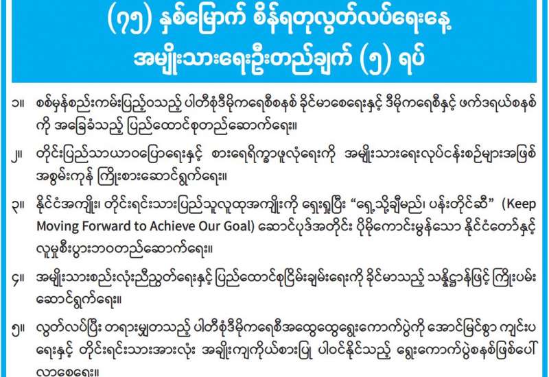 (၇၅) နှစ်မြောက် စိန်ရတုလွတ်လပ်ရေးနေ့ အထိမ်းအမှတ် လူငယ်နှင့်စာပေအနုပညာပြပွဲ လုပ်ငန်းညှိနှိုင်းအစည်းအဝေးကို ယနေ့မွန်းလွဲ ၂ နာရီတွင် နေပြည်တော်ရှိ ပြန်ကြားရေးဝန်ကြီးဌာန အစည်းအဝေးခန်းမ၌ ကျင်းပသည်။