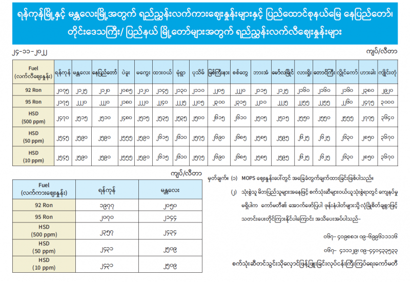 ရန်ကုန်မြို့နှင့် မန္တလေးမြို့အတွက် ရည်ညွှန်းလက်ကားဈေးနှုန်းများနှင့် ပြည်ထောင်စုနယ်မြေ နေပြည်တော်၊ တိုင်းဒေသကြီး/ ပြည်နယ် မြို့တော်များအတွက် ရည်ညွှန်းလက်လီဈေးနှုန်းများ