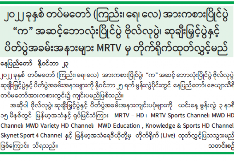 ၂၀၂၂ ခုနှစ် တပ်မတော် (ကြည်း၊ ရေ၊ လေ) အားကစားပြိုင်ပွဲ “က” အဆင့်ဘောလုံးပြိုင်ပွဲ ဗိုလ်လုပွဲ၊ ဆုချီးမြှင့်ပွဲနှင့် ပိတ်ပွဲအခမ်းအနားများ MRTV မှ တိုက်ရိုက်ထုတ်လွှင့်မည်