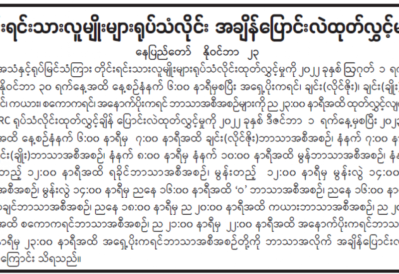 တိုင်းရင်းသားလူမျိုးများရုပ်သံလိုင်း အချိန်ပြောင်းလဲထုတ်လွှင့်မည်