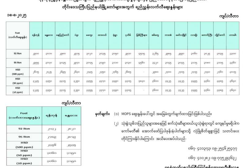 ရန်ကုန်မြို့နှင့် မန္တလေးမြို့အတွက် ရည်ညွှန်းလက်ကားဈေးနှုန်းများနှင့် ပြည်ထောင်စုနယ်မြေ နေပြည်တော်၊ တိုင်းဒေသကြီး/ ပြည်နယ်မြို့တော်များအတွက် ရည်ညွှန်းလက်လီဈေးနှုန်းများ