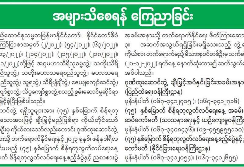 ရန်ကုန်တိုင်းဒေသကြီး၊ ဒဂုံမြို့သစ်(အရှေ့ပိုင်း)မြို့နယ်ရှိ လူဝင်မှုကြီးကြပ်ရေးနှင့် ပြည်သူ့အင်းအားဆိုင်ရာ မြို့နယ်ဦးစီးမှူးရုံး ဧည့်သည်နားနေဆောင်၌ ယနေ့နံနက်ပိုင်းက PDF အမည်ခံအကြမ်းဖက်သမားများ ထောင်ထားသည့် လက်လုပ်မိုင်းတစ်လုံး ပေါက်ကွဲမှုကြောင့် အပြစ်မဲ့အရပ်သားပြည်သူ အမျိုးသားတစ်ဦးနှင့် အမျိုးသမီးတစ်ဦးတို့ ထိခိုက်ဒဏ်ရာရရှိခဲ့ကြောင်း သိရသည်။