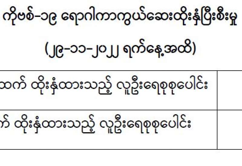 ကျန်းမာရေးဝန်ကြီးဌာနသည် COVID-19 သံသယလူနာများ၊ ဓာတ်ခွဲအတည်ပြုလူနာနှင့် အနီးကပ်ထိတွေ့ခဲ့သူများနှင့် အသွားအလာကန့်သတ်ထားရှိသူများအား COVID-19 ရောဂါ ရှိ၊ မရှိ ဓာတ်ခွဲစစ်ဆေးခြင်း ပုံမှန်ဆောင်ရွက်လျက်ရှိပြီး (၂၉-၁၁-၂၀၂၂) ရက်နေ့၊ ည(၈:၀၀)နာရီမှ (၃၀-၁၁-၂၀၂၂) ရက်နေ့၊ ည(၈:၀၀)နာရီအတွင်း ဓာတ်ခွဲနမူနာစုစုပေါင်း (၇,၉၄၁) ခုအား စစ်ဆေးပြီးစီးခဲ့ရာ COVID-19 ရောဂါ ဓာတ်ခွဲအတည်ပြုလူနာသစ် (၂၈) ဦး တွေ့ရှိရသဖြင့် ရောဂါပိုးတွေ့ရှိမှုရာခိုင်နှုန်းမှာ (၀.၃၅) ရာခိုင်နှုန်းရှိပါသည်။