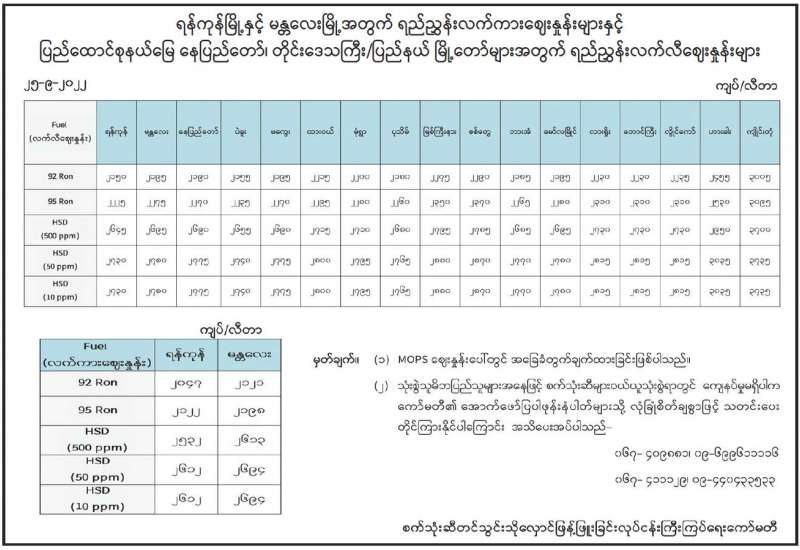 ရန်ကုန်မြို့နှင့် မန္တလေးမြို့အတွက် ရည်ညွှန်းလက်ကားဈေးနှုန်းများနှင့် ပြည်ထောင်စုနယ်မြေ နေပြည်တော်၊ တိုင်းဒေသကြီး/ ပြည်နယ် မြို့တော်များအတွက် ရည်ညွှန်းလက်လီဈေးနှုန်းများ
