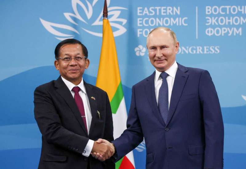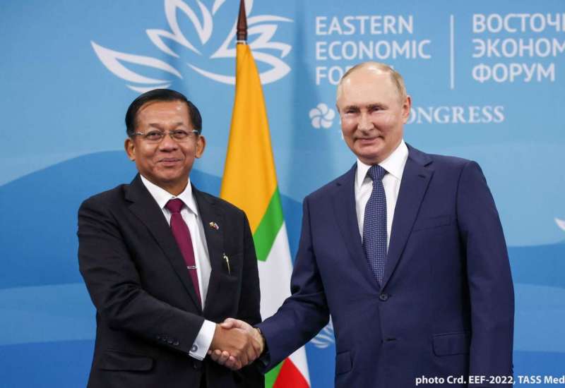 (၇) ကြိမ်မြောက် အရှေ့ဖျားစီးပွားရေးဖိုရမ် (The 7th Eastern Economic Forum -2022) သို့တက်ရောက်ရန် ရုရှားဖက်ဒရေးရှင်းနိုင်ငံသို့ ရောက်ရှိနေသည့် နိုင်ငံတော် စီမံအုပ်ချုပ်ရေးကောင်စီဥက္ကဋ္ဌ နိုင်ငံတော်ဝန်ကြီးချုပ် ဗိုလ်ချုပ်မှူးကြီး မင်းအောင်လှိုင်သည် ရုရှားဖက်ဒရေးရှင်းနိုင်ငံသမ္မတ H.E. Vladimir Vladimirovich Putin နှင့် ယနေ့ဒေသစံတော်ချိန် မွန်းလွဲပိုင်းတွင် ဗလာဒီဗော့စတော့ခ်မြို့၊ FEFU Campus အတွင်း၌ တွေ့ဆုံဆွေးနွေးသည်။