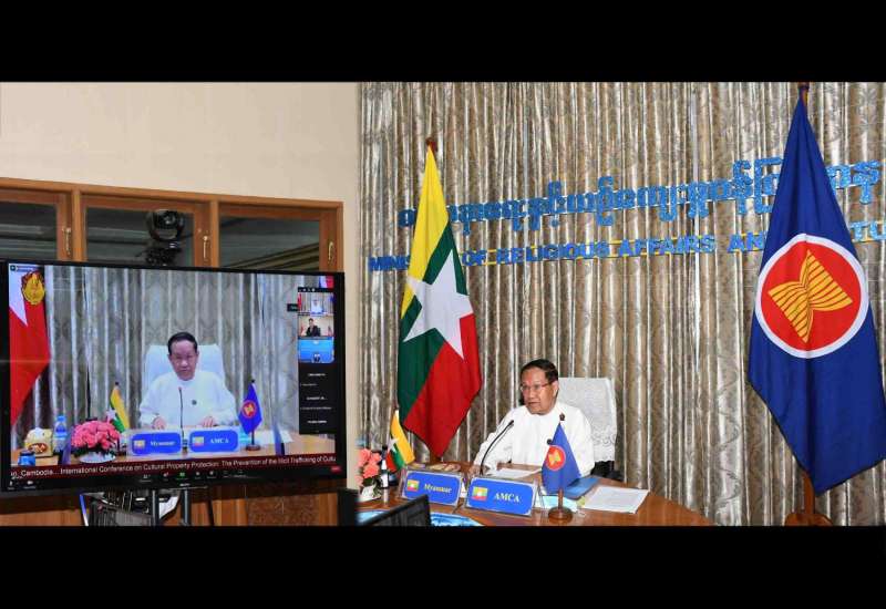 ကမ္ဘောဒီးယားနိုင်ငံ၊ ယဉ်ကျေးမှုနှင့်အနုပညာဝန်ကြီးဌာနမှ ကြီးမှူး၍ “ယဉ်ကျေးမှုပစ္စည်းများ အကာအကွယ်ပေးရေး နိုင်ငံတကာညီလာခံ--ယဉ်ကျေးမှုပစ္စည်းများ တရားမဝင်ရောင်းဝယ်မှု တားဆီးရေး-အာဆီယံရှုထောင့်” “International Conference on Cultural Property Protection: The Prevention of the Illicit Trafficking of Cultural Properties: An ASEAN Perspective" နိုင်ငံတကာညီလာခံကို ယနေ့တွင် Video conferencing စနစ်ဖြင့် ကျင်းပရာ မြန်မာနိုင်ငံ အာဆီယံယဉ်ကျေးမှုနှင့် အနုပညာဆိုင်ရာဝန်ကြီး၊ သာသနာရေးနှင့် ယဉ်ကျေးမှုဝန်ကြီးဌာန ပြည်ထောင်စုဝန်ကြီးဦးကိုကို ဦးဆောင်သော မြန်မာကိုယ်စား လှယ်အဖွဲ့ ပါဝင်တက်ရောက်သည်။