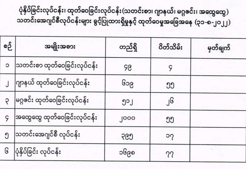 ပုံနှိပ်ခြင်းလုပ်ငန်း၊ ထုတ်ဝေခြင်းလုပ်ငန်း(သတင်းစာ၊ ဂျာနယ်၊ မဂ္ဂဇင်း၊ အထွေထွေ) သတင်းအေဂျင်စီလုပ်ငန်းများ ခွင့်ပြုထားရှိမှုနှင့် ထုတ်ဝေမှုအခြေအနေ (၃၁-၈-၂၀၂၂)
