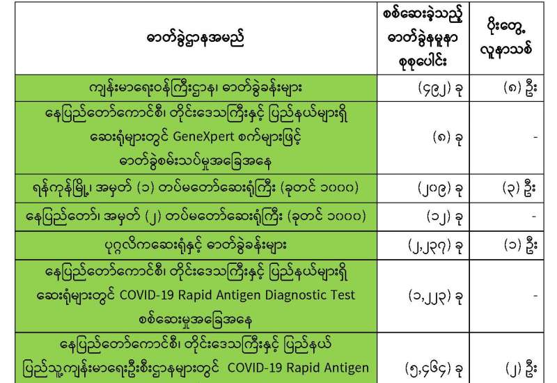 ကျန်းမာရေးဝန်ကြီးဌာနအနေဖြင့် နိုင်ငံအတွင်း ကူးစက်ဖြစ်ပွားနေသော COVID-19 ရောဂါ ကာကွယ်၊ ကုသ၊ ထိန်းချုပ်ရေးလုပ်ငန်းများကို အရှိန်အဟုန်မပြတ် ဆောင်ရွက်လျက်ရှိရာ ရောဂါ ထိန်း ချုပ်ရေးလုပ်ငန်းများ အောင်မြင်နိုင်ရေးအတွက် ပြည်သူလူထုအနေဖြင့် ကျန်းမာရေးဝန်ကြီး ဌာနမှ ထုတ်ပြန်ထားသော COVID-19 ရောဂါကာကွယ်ထိန်းချုပ်ရေးဆိုင်ရာ စည်းကမ်းများကို စနစ် တကျ လိုက်နာဆောင်ရွက်ရန် လိုအပ်ပြီး COVID-19 ကာကွယ်ဆေးထိုးနှံမှုခံယူခြင်းအား အထူးဂရုပြု ပူးပေါင်း ဆောင်ရွက်ကြရန် လိုအပ်ပါသည်။