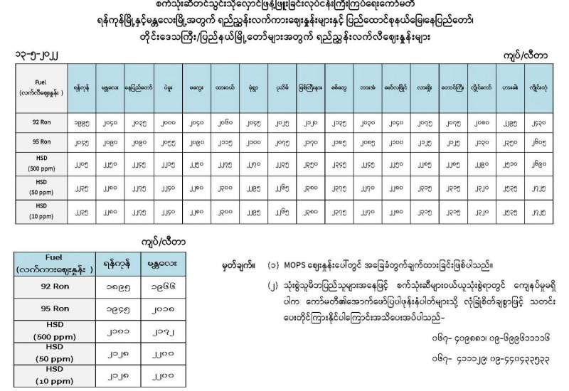 စက်သုံးဆီတင်သွင်းသိုလှောင်ဖြန့်ဖြူးခြင်းလုပ်ငန်းကြီးကြပ်ရေးကော်မတီ ရန်ကုန်မြို့နှင့် မန္တလေးမြို့အတွက် ရည်ညွှန်းလက်ကားဈေးနှုန်းများနှင့် ပြည်ထောင်စုနယ်မြေ၊ နေပြည်တော်၊ တိုင်းဒေသကြီး/ပြည်နယ်မြို့တော်များအတွက် ရည်ညွှန်းလက်လီဈေးနှုန်းများ