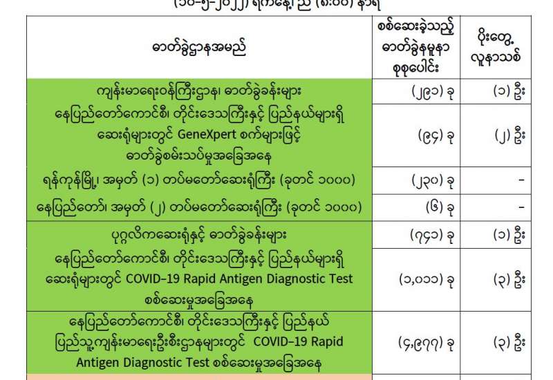(၁၀-၅-၂၀၂၂) ရက်နေ့၊ ည (၈:၀၀) နာရီ ကျန်းမာရေးဝန်ကြီးဌာနအနေဖြင့် နိုင်ငံအတွင်း ကူးစက်ဖြစ်ပွားနေသော COVID-19 ရောဂါ ကာကွယ်၊ ကုသ၊ ထိန်းချုပ်ရေးလုပ်ငန်းများကို အရှိန်အဟုန်မပျက် ဆောင်ရွက်လျက်ရှိပါသည်။