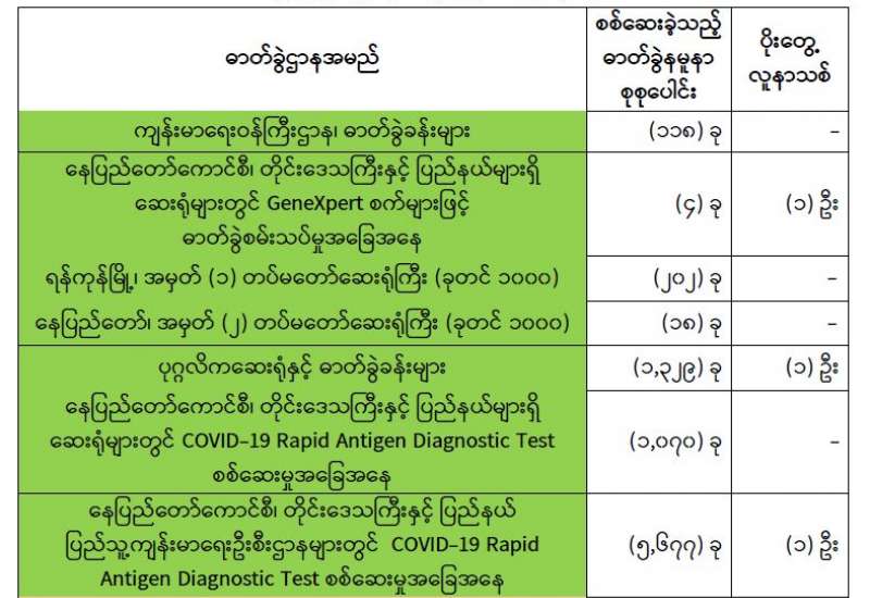 ကျန်းမာရေးဝန်ကြီးဌာနအနေဖြင့် နိုင်ငံအတွင်း ကူးစက်ဖြစ်ပွားနေသော COVID-19 ရောဂါ ကာကွယ်၊ ကုသ၊ ထိန်းချုပ်ရေးလုပ်ငန်းများကို အရှိန်အဟုန်မြှင့် ဆောင်ရွက်လျက်ရှိပါသည်။