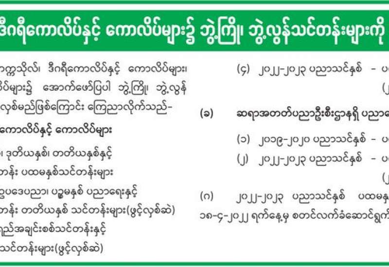ပညာရေးဝန်ကြီးဌာနရှိ တက္ကသိုလ်၊ ဒီဂရီကောလိပ်နှင့် ကောလိပ်များ၌ ဘွဲ့ကြို၊ ဘွဲ့လွန်သင်တန်းများ ကို မေ ၁၂ ရက်တွင် စတင်ဖွင့်လှစ်မည်