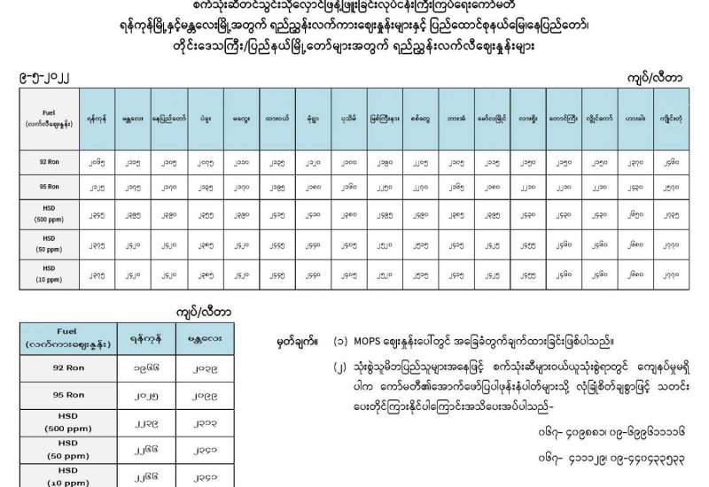 စက်သုံးဆီတင်သွင်းသိုလှောင်ဖြန့်ဖြူးခြင်းလုပ်ငန်းကြီးကြပ်ရေးကော်မတီ ရန်ကုန်မြို့နှင့်မန္တလေးမြို့အတွက် ရည်ညွှန်းလက်ကားဈေးနှုန်းများနှင့် ပြည်ထောင်စုနယ်မြေ၊ နေပြည်တော်၊ တိုင်းဒေသကြီး/ပြည်နယ်မြို့တော်များအတွက် ရည်ညွှန်းလက်လီဈေးနှုန်းများ