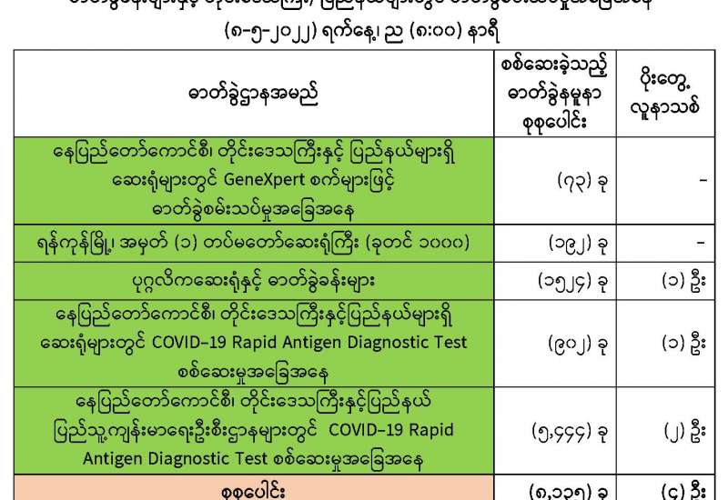 ကျန်းမာရေးဝန်ကြီးဌာနအနေဖြင့် နိုင်ငံအတွင်း ကူးစက်ဖြစ်ပွားနေသော COVID-19 ရောဂါ ကာကွယ်၊ ကုသ၊ ထိန်းချုပ်ရေးလုပ်ငန်းများကို အရှိန်အဟုန်မြှင့်ဆောင်ရွက်လျက်ရှိရာ ရောဂါ ထိန်း ချုပ်ရေးလုပ်ငန်းများ အောင်မြင်နိုင်ရေးအတွက် ပြည်သူလူထုအနေဖြင့် ကျန်းမာရေးဝန်ကြီးဌာနမှ ထုတ်ပြန်ထားသော COVID-19 ရောဂါကာကွယ်ထိန်းချုပ်ရေးဆိုင်ရာ စည်းကမ်းများကို စနစ်တကျ လိုက်နာဆောင်ရွက်ရန် လိုအပ်ပြီး COVID-19 ကာကွယ်ဆေးထိုးနှံမှုခံယူခြင်းအား အထူးဂရုပြု ပူးပေါင်း ဆောင်ရွက်ကြရန် လိုအပ်ပါသည်။