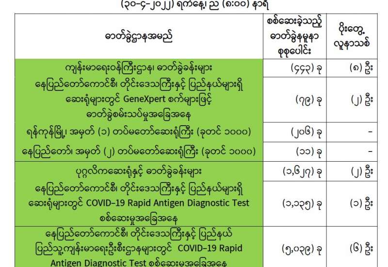 ကျန်းမာရေးဝန်ကြီးဌာနအနေဖြင့် နိုင်ငံအတွင်း ကူးစက်ဖြစ်ပွားနေသော COVID-19 ရောဂါ ကာကွယ်၊ ကုသ၊ ထိန်းချုပ်ရေးလုပ်ငန်းများကို အရှိန်အဟုန်မြှင့်ဆောင်ရွက်လျက် ရှိပါသည်။