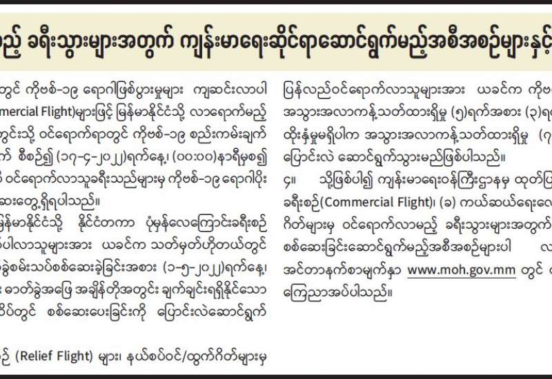ပြည်ပနိုင်ငံများမှ ဝင်ရောက်လာသည့် ခရီးသွားများအတွက် ကျန်းမာရေးဆိုင်ရာ ဆောင်ရွက်မည့် အစီအစဉ်များနှင့်စပ်လျဉ်း၍ သတင်းထုတ်ပြန်ခြင်း