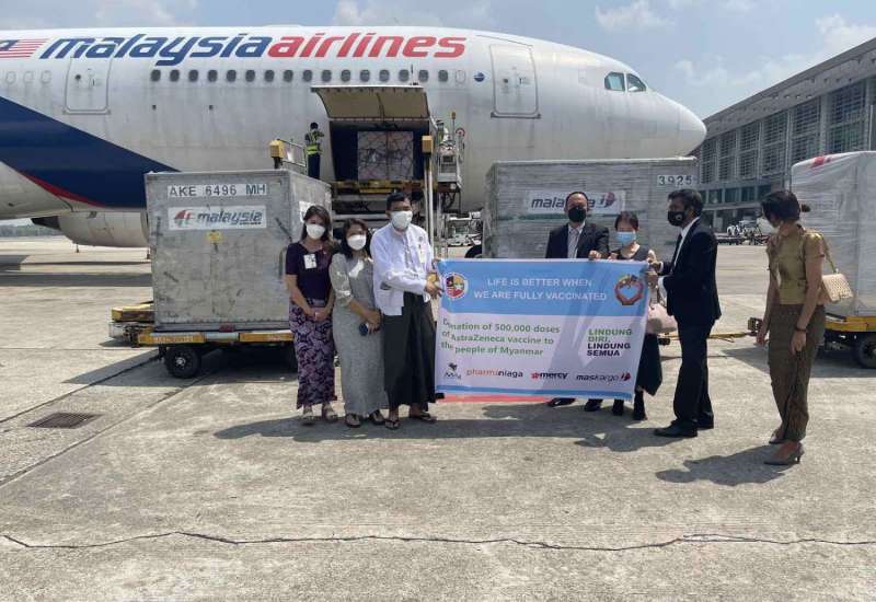 မလေးရှားနိုင်ငံမှ မြန်မာနိုင်ငံသို့လှူဒါန်းသော Astrazeneca အမှတ်တံဆိပ် ကိုဗစ်-၁၉ ရောဂါ ကာကွယ်ဆေး (၅)သိန်း doses သည် ယနေ့နံနက်ပိုင်းတွင် မလေးရှားနိုင်ငံ၊ ကွာလာလမ်ပူ လေဆိပ်မှ မလေးရှားလေကြောင်းလိုင်း ကုန်တင်ယာဉ်ဖြင့် ရန်ကုန်အပြည်ပြည်ဆိုင်ရာ လေဆိပ်သို့ ရောက်ရှိသည်။