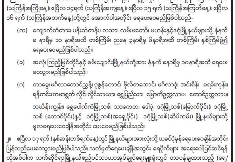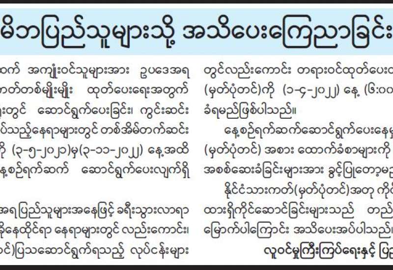 ပြည်ထဲရေးဝန်ကြီးဌာန တပ်ဖွဲ့ဝင်/ဝန်ထမ်း အရာထမ်း၊ အမှုထမ်း မိသားစုများက မြို့နယ်အသီးသီးရှိ ဘုန်းတော်ကြီးကျောင်းများသို့ ဆွမ်းဆန်တော်များ ဆက်ကပ်လှူဒါန်းခြင်း ကို ဆောင်ရွက်လျက်ရှိသည်။