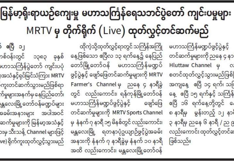 မြန်မာ့ရိုးရာယဉ်ကျေးမှု မဟာသင်္ကြန်ရေသဘင်ပွဲတော် ကျင်းပမှုများ MRTV မှ တိုက်ရိုက် (Live) ထုတ်လွှင့်တင်ဆက်မည်