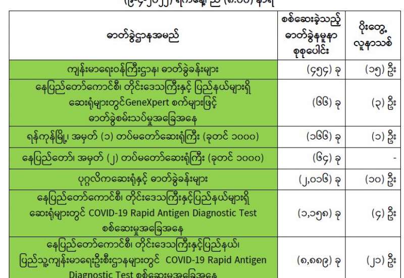 ကျန်းမာရေးဝန်ကြီးဌာနအနေဖြင့် နိုင်ငံအတွင်း ကူးစက်ဖြစ်ပွားနေသော COVID-19 ရောဂါ ကာကွယ်၊ ကုသ၊ ထိန်းချုပ်ရေးလုပ်ငန်းများကို အရှိန်အဟုန်မြှင့် ဆောင်ရွက်လျက်ရှိပါသည်။