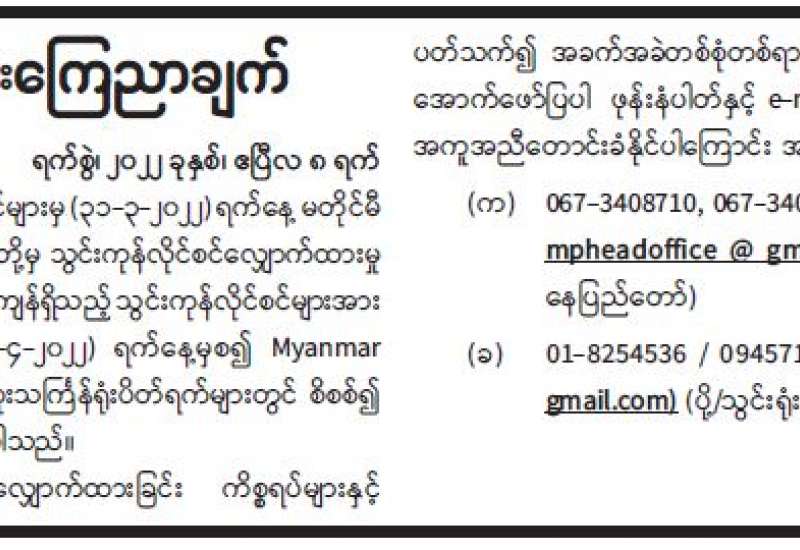နိုင်ငံတကာလေကြောင်းလိုင်းများကို ဧပြီ ၁၇ ရက်၊ မြန်မာနှစ်သစ်ကူး နှစ်ဆန်း ၁ ရက်နေ့မှစ၍ ရန်ကုန်အပြည်ပြည်ဆိုင်ရာလေဆိပ်အား ဖွင့်လှစ်သွားမည်ဖြစ်ရာ အပြည်ပြည်ဆိုင်ရာ မြန်မာလေ ကြောင်း လိုင်း(MAI)အနေဖြင့် ပြည်တွင်း ပြည်ပခရီးစဉ်များကို တိုးချဲ့ပြေးဆွဲသွားမည်ဖြစ်ကြောင်း သိရသည်။