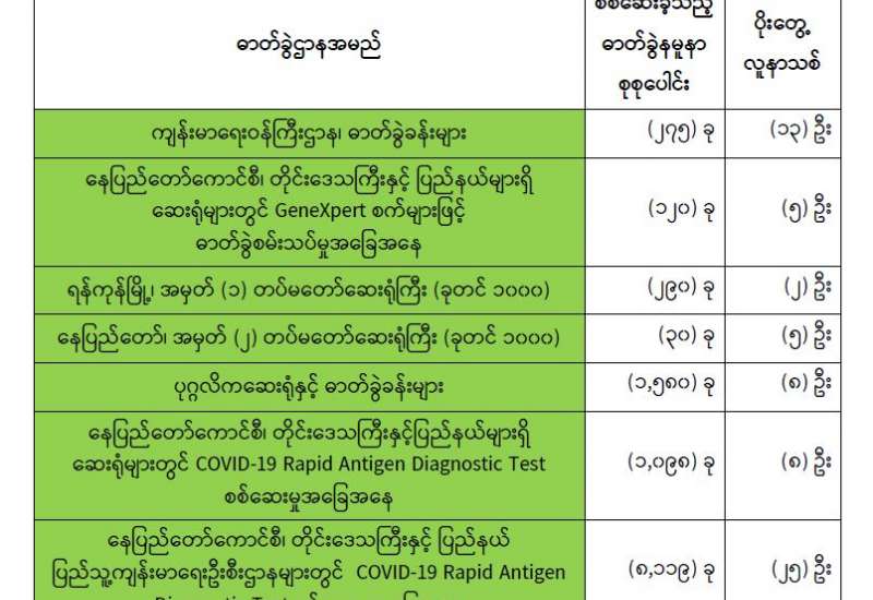 ကျန်းမာရေးဝန်ကြီးဌာနအနေဖြင့် နိုင်ငံအတွင်း ကူးစက်ဖြစ်ပွားနေသော COVID-19 ရောဂါ ကာကွယ်၊ ကုသ၊ ထိန်းချုပ်ရေးလုပ်ငန်းများကို အရှိန်အဟုန်မြှင့် ဆောင်ရွက်လျက်ရှိရာ ရောဂါထိန်းချုပ်ရေးလုပ်ငန်းများ အောင်မြင်နိုင်ရေးအတွက် ပြည်သူလူထုအနေဖြင့် ကျန်းမာရေး ဝန်ကြီးဌာနမှ ထုတ်ပြန်ထားသော COVID-19 ရောဂါ ကာကွယ်ထိန်းချုပ်ရေးဆိုင်ရာ စည်းကမ်းများကို စနစ်တကျ လိုက်နာဆောင်ရွက်ရန် လိုအပ်ပြီး COVID-19 ကာကွယ်ဆေးထိုးနှံမှုခံယူခြင်းအား အထူးဂရုပြု ပူးပေါင်းဆောင်ရွက်ကြရန် လိုအပ်ပါသည်။