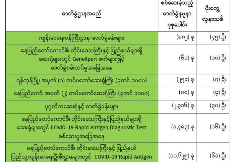 ကျန်းမာရေးဝန်ကြီးဌာနအနေဖြင့် နိုင်ငံအတွင်း ကူးစက်ဖြစ်ပွားနေသော COVID-19 ရောဂါ ကာကွယ်၊ ကုသ၊ ထိန်းချုပ်ရေးလုပ်ငန်းများကို အရှိန်အဟုန်မြှင့် ဆောင်ရွက်လျက်ရှိရာ ရောဂါ ထိန်းချုပ်ရေးလုပ်ငန်းများ အောင်မြင်နိုင်ရေးအတွက် ပြည်သူလူထုအနေဖြင့် ကျန်းမာရေး ဝန်ကြီးဌာနမှ ထုတ်ပြန်ထားသော COVID-19 ရောဂါကာကွယ်ထိန်းချုပ်ရေး ဆိုင်ရာ စည်းကမ်း များကို စနစ် တကျလိုက်နာ ဆောင်ရွက်ရန်လိုအပ်ပြီး COVID-19 ကာကွယ်ဆေးထိုးနှံ မှုခံယူခြင်းအား အထူးဂရုပြု ပူးပေါင်းဆောင်ရွက်ကြရန် လိုအပ်ပါသည်။