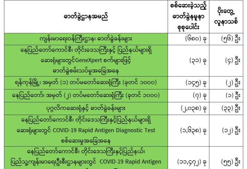 ကျန်းမာရေးဝန်ကြီးဌာနအနေဖြင့် နိုင်ငံအတွင်း ကူးစက်ဖြစ်ပွားနေသော COVID-19 ရောဂါ ကာကွယ်၊ ကုသ၊ ထိန်းချုပ်ရေးလုပ်ငန်းများကို အရှိန်အဟုန်မြှင့်ဆောင်ရွက်လျက်ရှိပါသည်။