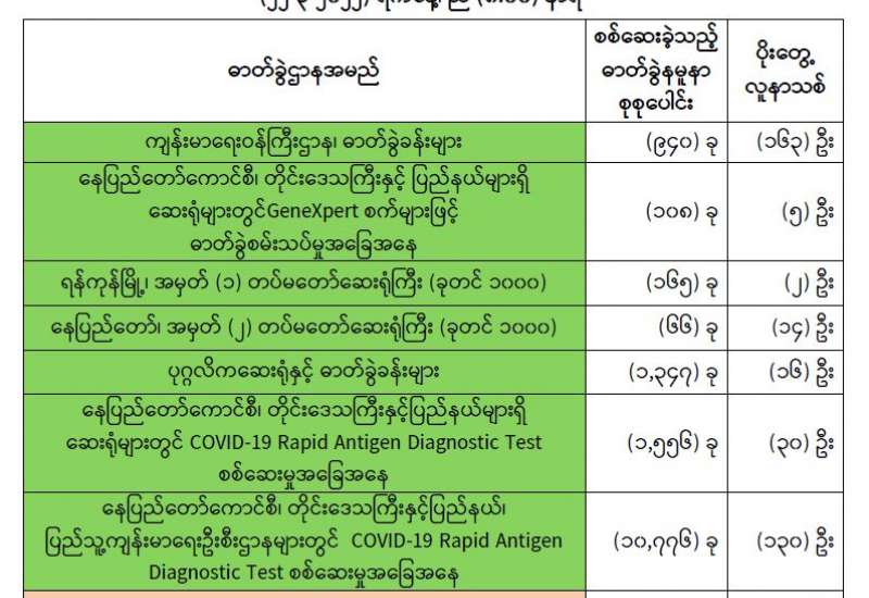 ကျန်းမာရေးဝန်ကြီးဌာနအနေဖြင့် နိုင်ငံအတွင်း ကူးစက်ဖြစ်ပွားနေသော COVID-19 ရောဂါ ကာကွယ်၊ ကုသ၊ ထိန်းချုပ်ရေးလုပ်ငန်းများကို အရှိန်အဟုန်မြှင့်ဆောင်ရွက်လျက်ရှိပါသည်။