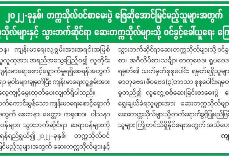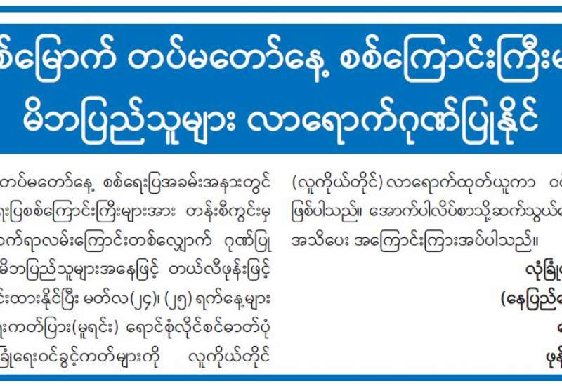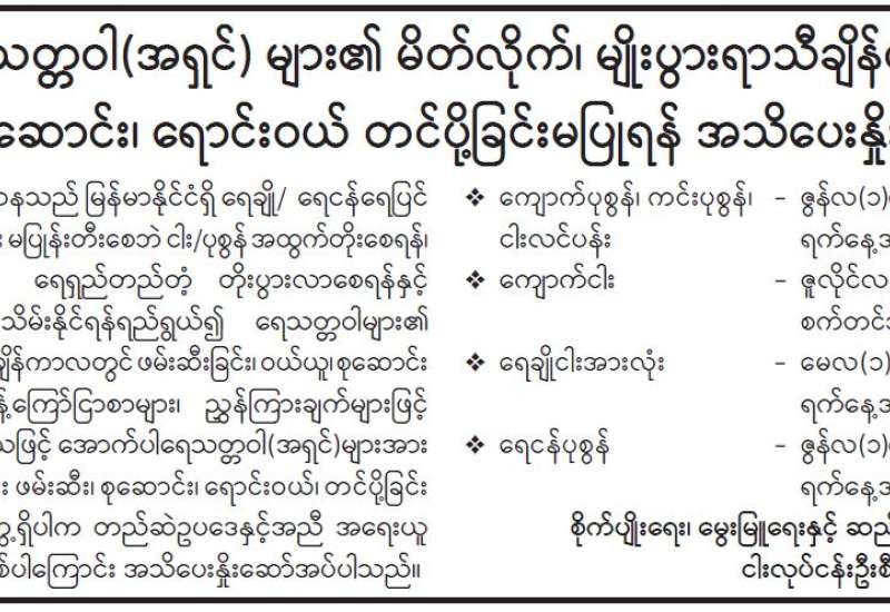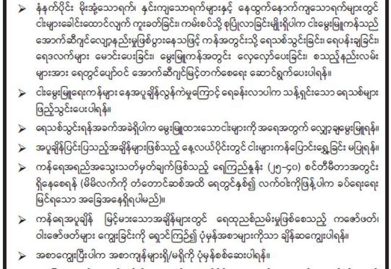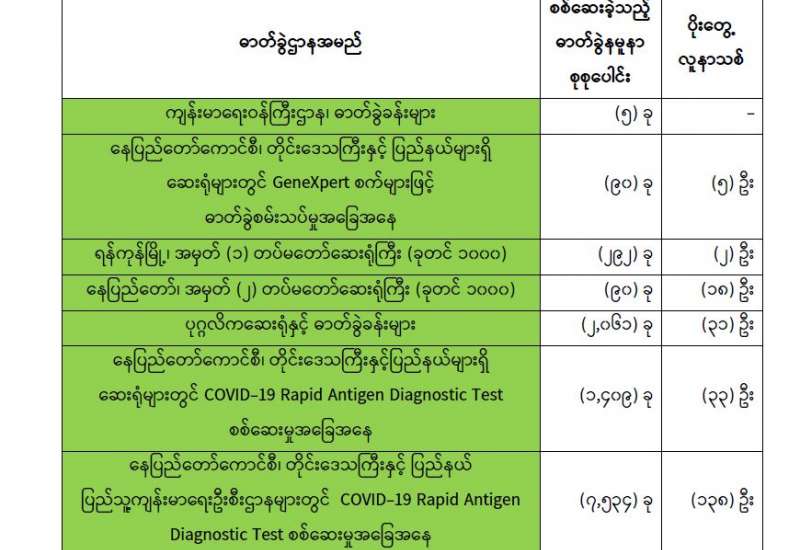 ကျန်းမာရေးဝန်ကြီးဌာနအနေဖြင့် နိုင်ငံအတွင်း ကူးစက်ဖြစ်ပွားနေသော COVID-19 ရောဂါ ကာကွယ်၊ ကုသ၊ ထိန်းချုပ်ရေးလုပ်ငန်းများကို အရှိန်အဟုန်မြှင့် ဆောင်ရွက်လျက်ရှိရာ ရောဂါထိန်းချုပ်ရေးလုပ်ငန်းများ အောင်မြင်နိုင်ရေးအတွက် ပြည်သူလူထုအနေဖြင့် ကျန်းမာရေးဝန်ကြီးဌာနမှ ထုတ်ပြန်ထားသော COVID-19 ရောဂါကာကွယ် ထိန်းချုပ်ရေးဆိုင်ရာ စည်းကမ်းများကို စနစ်တကျလိုက်နာ ဆောင်ရွက်ရန်လိုအပ်ပြီး COVID-19 ကာကွယ်ဆေး ထိုးနှံမှုခံယူခြင်းအား အထူးဂရုပြု ပူးပေါင်းဆောင်ရွက်ကြရန် လိုအပ်ပါသည်။