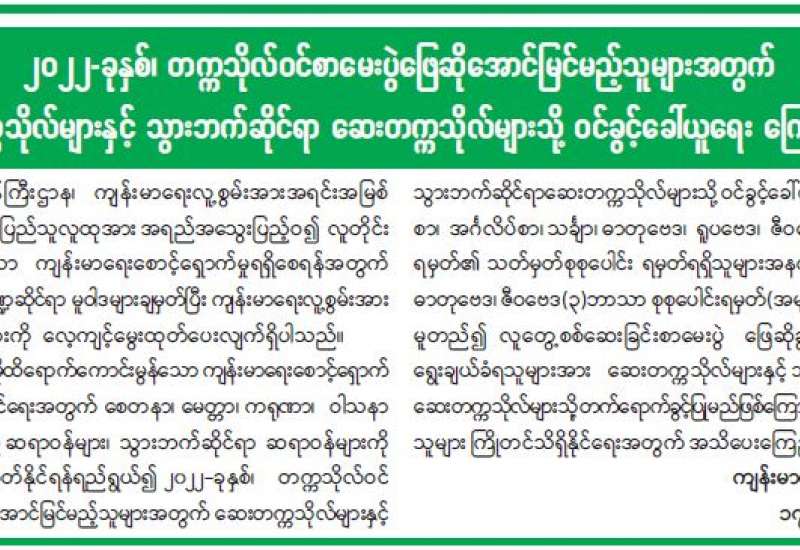 စီးပွားရေးနှင့် ကူးသန်းရောင်းဝယ်ရေးဝန်ကြီးဌာနနှင့် မြန်မာနိုင်ငံ စက်သုံးဆီ တင်သွင်းရောင်းချ ဖြန့်ဖြူးရေးအသင်းတို့ ပူးပေါင်းစီစဉ်မှုဖြင့် ပြည်သူများသက်သာသော ဈေးနှုန်းဖြင့်ဝယ်ယူ ရရှိနိုင်ရန်ရည်ရွယ်၍ ဗဟိုဘဏ်မှ ရည်ညွှန်းငွေလဲနှုန်းဖြင့် တိုက်ရိုက်ရောင်းချပေးသည့် နိုင်ငံခြား ငွေအမေရိကန်ဒေါ်လာ ၃၉ သန်းဖြင့် စက်သုံးဆီမှာယူတင် သွင်းခဲ့သည့် ကုမ္ပဏီ ၂၆ ခုမှ ဒီဇယ်ဆီ ဂါလံ ၁၂ ဒသမ ၅၄ သန်းခန့်ကို အထူးဈေးနှုန်းဖြင့် ဖြန့်ဖြူးရောင်းချပေးလျက်ရှိပြီး မတ်လ ၁၉ ရက် နေ့တွင် ကုမ္ပဏီ ၁၂ ခုမှ တိုင်းဒေသကြီး/ ပြည်နယ်များရှိ စက်သုံးဆီ အရောင်းဆိုင် စုစုပေါင်း ၁၁၃ ဆိုင်တွင် ဖြန့်ဖြူးရောင်းချ ပေးသွားမည်ဖြစ်သည်။