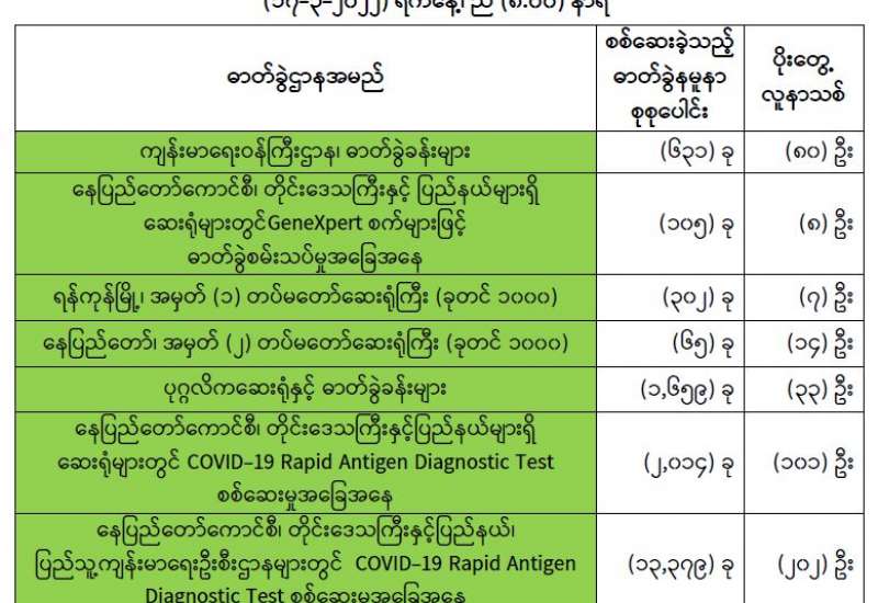 ကျန်းမာရေးဝန်ကြီးဌာနအနေဖြင့် နိုင်ငံအတွင်း ကူးစက်ဖြစ်ပွားနေသော COVID-19 ရောဂါ ကာကွယ်၊ ကုသ၊ ထိန်းချုပ်ရေးလုပ်ငန်းများကို အရှိန်အဟုန်မြှင့် ဆောင်ရွက်လျက်ရှိပါသည်။