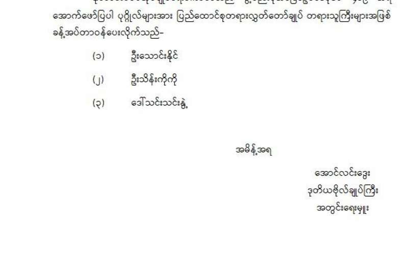 ပြည်ထောင်စုသမ္မတမြန်မာနိုင်ငံတော် နိုင်ငံတော်စီမံအုပ်ချုပ်ရေးကောင်စီ အမိန့်အမှတ် ၂၁ / ၂၀၂၂ ၁၃၈၃ ခုနှစ်၊ တပေါင်းလဆန်း ၁၃ ရက် (၂၀၂၂ ခုနှစ်၊ မတ်လ ၁၄ ရက်) နိုင်ငံတော်ဖွဲ့စည်းပုံ အခြေခံဥပဒေဆိုင်ရာခုံရုံးဥက္ကဋ္ဌ ခန့်အပ်တာဝန်ပေးခြင်း