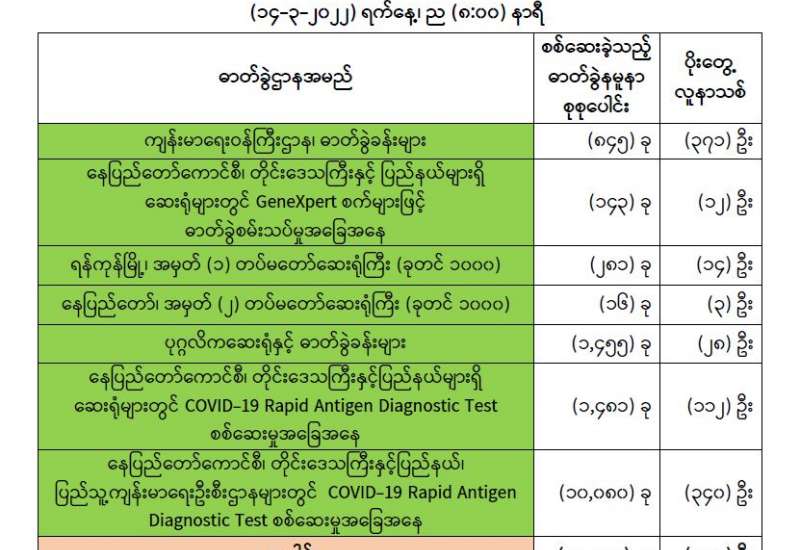 (၁၄-၃-၂၀၂၂) ရက်နေ့၊ ည (၈:၀၀) နာရီ ကျန်းမာရေးဝန်ကြီးဌာနအနေဖြင့် နိုင်ငံအတွင်း ကူးစက်ဖြစ်ပွားနေသော COVID-19 ရောဂါ ကာကွယ်၊ ကုသ၊ ထိန်းချုပ်ရေးလုပ်ငန်းများကို အရှိန်အဟုန်မြှင့်ဆောင်ရွက်လျက်ရှိပါသည်။