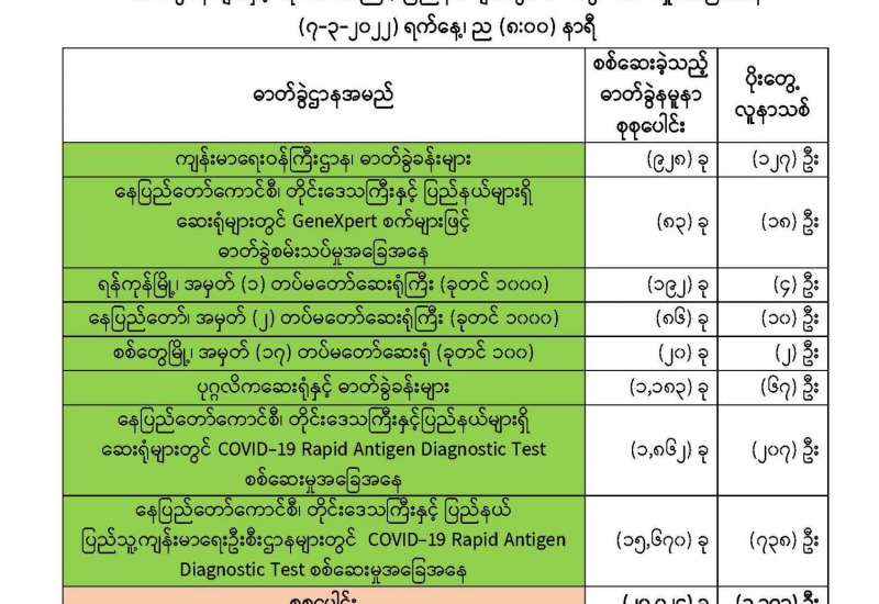 (၆-၃-၂၀၂၂) ရက်နေ့၊ ည (၈:၀၀) နာရီမှ (၇-၃-၂၀၂၂) ရက်နေ့၊ ည (၈:၀၀) နာရီအတွင်း ဓာတ်ခွဲနမူနာစုစုပေါင်း (၂၀,၀၂၄) ခုအား စစ်ဆေးပြီးစီးခဲ့ရာ COVID-19 ရောဂါ ဓာတ်ခွဲအတည်ပြုလူနာသစ် (၁,၁၇၃) ဦး တွေ့ရှိရပါသည်။ ထို့ကြောင့် ယနေ့အတွက် ရောဂါ ပိုးတွေ့ရှိမှု ရာခိုင်နှုန်းမှာ (၅.၈၆) ရာခိုင်နှုန်း ရှိပါသည်။