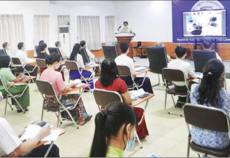 မြန်မာနိုင်ငံ အမျိုးသားလူ့အခွင့် အရေးကော်မရှင်ရုံးမှ အရာထမ်း၊ အမှုထမ်းများအတွက် ဌာနတွင်း လူ့အခွင့်အရေး အသိပညာပေး သင်တန်း အမှတ်စဉ် (၁/၂၀၂၂) ဖွင့်လှစ်ခြင်း အခမ်းအနားကို ယနေ့ မွန်းလွဲ ၁ နာရီတွင် ကော်မရှင်ရုံး Conference Room ၌ ကိုဗစ်-၁၉ ကပ်ရောဂါ ကာလအတွင်း လိုက်နာနေထိုင်ရမည့် စည်းမျဉ်းစည်းကမ်းများနှင့်အညီ ကျင်းပသည်။