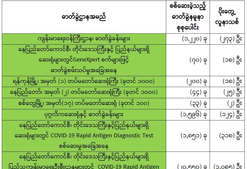 ကျန်းမာရေးဝန်ကြီးဌာနအနေဖြင့် နိုင်ငံအတွင်း ကူးစက်ဖြစ်ပွားနေသော COVID-19 ရောဂါ ကာကွယ်၊ ကုသ၊ ထိန်းချုပ်ရေးလုပ်ငန်းများကို အရှိန်အဟုန်မြှင့် ဆောင်ရွက်လျက်ရှိပါသည်။
