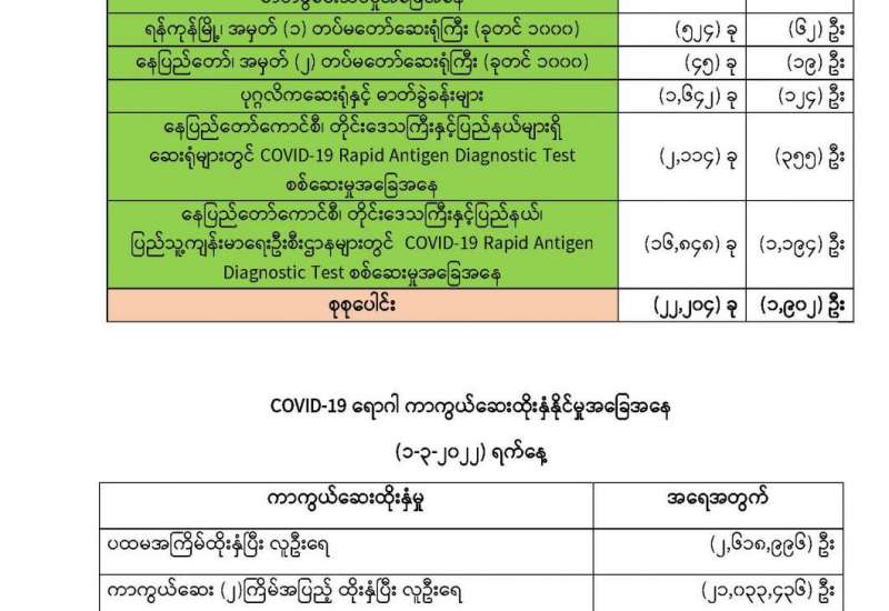 ကျန်းမာရေးဝန်ကြီးဌာနအနေဖြင့် နိုင်ငံအတွင်း ကူးစက်ဖြစ်ပွားနေသော COVID-19 ရောဂါ ကာကွယ်၊ ကုသ၊ ထိန်းချုပ်ရေးလုပ်ငန်းများကို အရှိန်အဟုန်မြှင့်ဆောင်ရွက်လျက်ရှိရာ ရောဂါထိန်းချုပ်ရေးလုပ်ငန်းများ အောင်မြင်နိုင်ရေးအတွက် ပြည်သူလူထုအနေဖြင့် ကျန်းမာရေးဝန်ကြီးဌာနမှ ထုတ်ပြန်ထားသော COVID-19 ရောဂါကာကွယ် ထိန်းချုပ်ရေးဆိုင်ရာ စည်းကမ်းများကို စနစ်တကျလိုက်နာ ဆောင်ရွက်ရန်လိုအပ်ပြီး COVID-19 ကာကွယ်ဆေး ထိုးနှံမှုခံယူခြင်းအား အထူးဂရုပြု ပူးပေါင်းဆောင်ရွက်ကြရန် လိုအပ်ပါသည်။