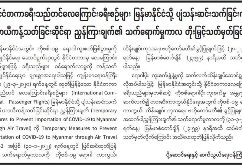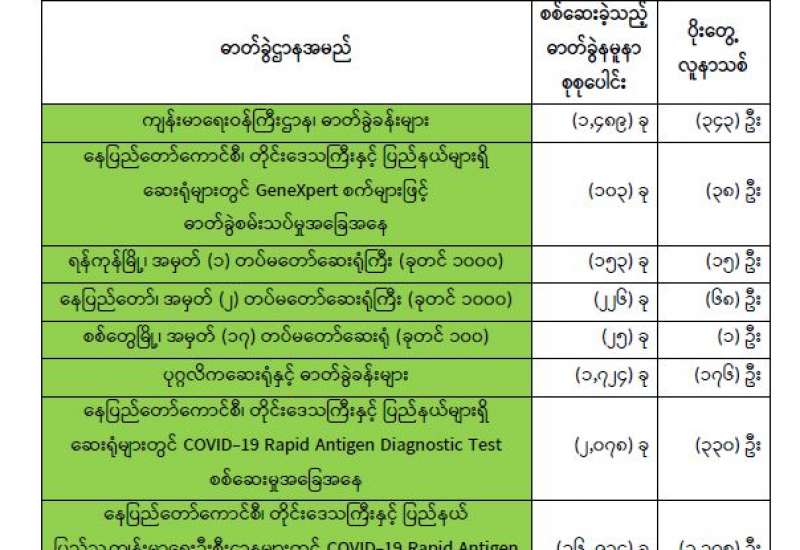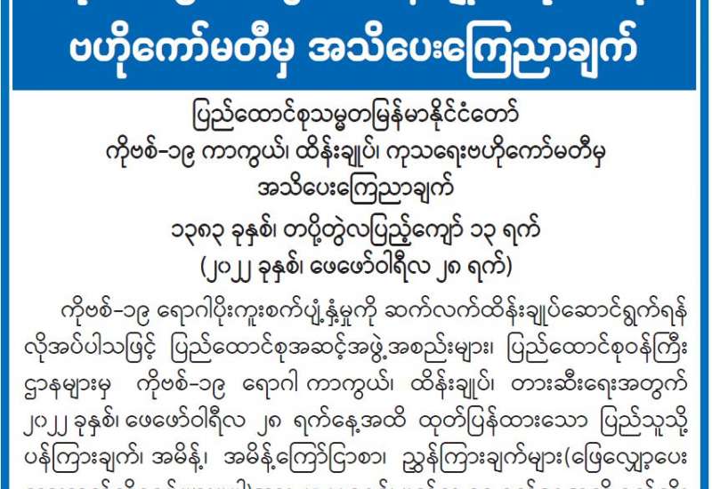 (၁-၃-၂၀၂၂) ရက်နေ့၊ ည (၈:၀၀) နာရီ ကျန်းမာရေးဝန်ကြီးဌာနအနေဖြင့် နိုင်ငံအတွင်း ကူးစက်ဖြစ်ပွားနေသော COVID-19 ရောဂါ ကာကွယ်၊ ကုသ၊ ထိန်းချုပ်ရေး လုပ်ငန်းများကို အရှိန်အဟုန်မြှင့် ဆောင်ရွက်လျက်ရှိပါသည်။