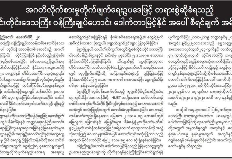 တရားမဝင်ကုန်သွယ်မှုတိုက်ဖျက်ရေး ဦးဆောင်ကော်မတီ၏ ကြီးကြပ်ကွပ်ကဲမှုဖြင့် တရားမဝင် ကုန်သွယ်မှုများကို ဥပဒေနှင့်အညီ ထိရောက်စွာ တားဆီးအရေးယူနိုင်ရေး ဆောင်ရွက်လျက်ရှိရာ ဖေဖော်ဝါရီ ၂၆ ရက်တွင် ချင်းပြည်နယ် တရားမဝင်ကုန်သွယ်မှု တိုက်ဖျက်ရေးအထူးအဖွဲ့၏ စီမံ ခန့်ခွဲမှုဖြင့် ပြည်နယ်သစ်တော ဦးစီးဌာနက ဦးဆောင်၍ ပူးပေါင်း စစ်ဆေးရေးအဖွဲ့များမှ စစ်ဆေးမှုများ ဆောင်ရွက်ခဲ့ရာ မင်းတပ်ခရိုင် ပလက်ဝမြို့နယ်အတွင်း တရားမဝင် ကညင်ခွဲသားဝဒသမ ၉၀၈၈ တန် (ခန့်မှန်းတန်ဖိုး ငွေကျပ် ၇၄၅၁) ကို ဖမ်းဆီးရမိခဲ့ပြီး သစ်တောဥပဒေနှင့်အညီ အရေးယူ ဆောင်ရွက်လျက်ရှိသည်။