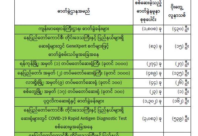 ကျန်းမာရေးဝန်ကြီးဌာနအနေဖြင့် နိုင်ငံအတွင်း ကူးစက်ဖြစ်ပွားနေသော COVID-19 ရောဂါ ကာကွယ်၊ ကုသ၊ ထိန်းချုပ်ရေးလုပ်ငန်းများကို အရှိန်အဟုန်မြှင့် ဆောင်ရွက်လျက်ရှိပါသည်။