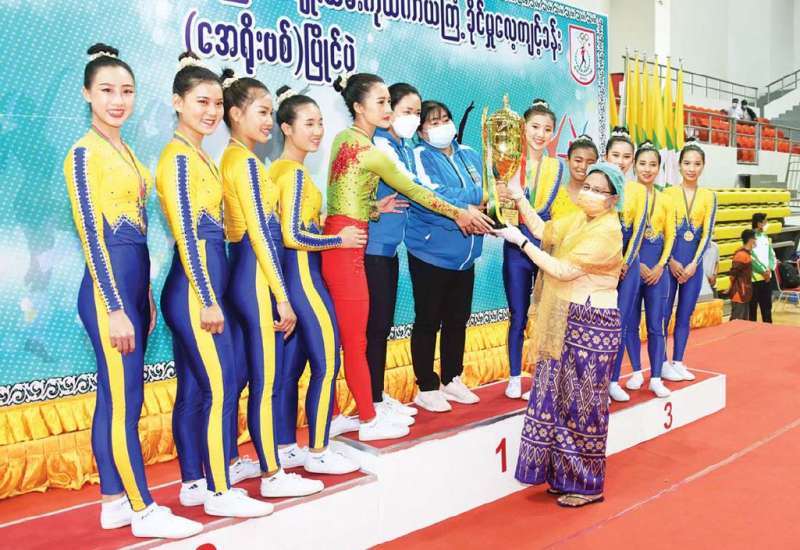 ၂၀၂၂ ခုနှစ် တိုင်းဒေသကြီးနှင့် ပြည်နယ် အမျိုးသမီး ကိုယ်ကာယကြံ့ခိုင်မှု လေ့ကျင့်ခန်း (အေရိုးဗစ်) ပြိုင်ပွဲ ပိတ်ပွဲနှင့် ဆုချီးမြှင့်ခြင်း အခမ်းအနားကို ယနေ့မွန်းလွဲပိုင်းတွင် နေပြည်တော် ဝဏ္ဏသိဒ္ဓိ အားကစားရုံ (B) ၌ ကိုဗစ်-၁၉ ရောဂါ ကာကွယ်ထိန်းချုပ်ကုသရေးဆိုင်ရာ စည်းမျဉ်း၊ စည်းကမ်းများနှင့်အညီ ကျင်းပရာ နိုင်ငံတော် စီမံအုပ်ချုပ်ရေးကောင်စီအဖွဲ့ဝင် ဒေါ်အေးနုစိန်၊ Jean Phang နော်တောင်နှင့် စောဒန်နီယယ်၊ အားကစားနှင့် လူငယ်ရေးရာဝန်ကြီးဌာန ဒုတိယဝန်ကြီး ဦးမျိုးလှိုင်နှင့် ဌာနဆိုင်ရာများမှ တာဝန်ရှိသူများ၊ ဝန်ထမ်းများ တက်ရောက်ကြည့်ရှုအားပေး ကြသည်။
