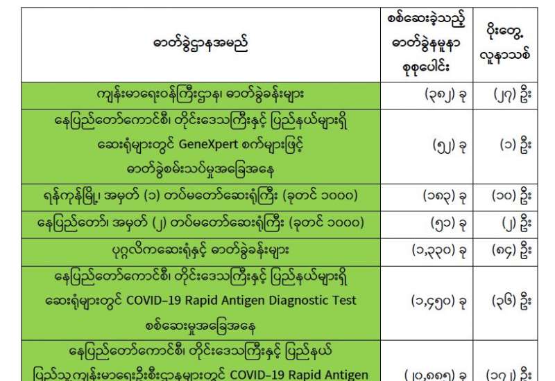 ကျန်းမာရေးဝန်ကြီးဌာနအနေဖြင့် နိုင်ငံအတွင်း ကူးစက်ဖြစ်ပွားနေသော COVID-19 ရောဂါ ကာကွယ်၊ ကုသ၊ ထိန်းချုပ်ရေးလုပ်ငန်းများကို အရှိန်အဟုန်မြှင့် ဆောင်ရွက်လျက်ရှိပါသည်။
