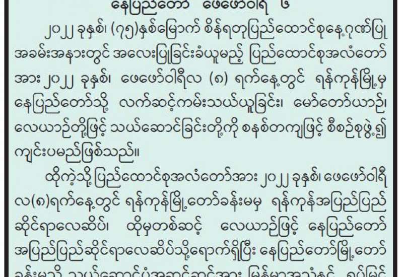 ရန်ကုန်တိုင်းဒေသကြီးအတွင်း ကိုဗစ်-၁၉ ရောဂါဖြစ်ပွားမှုများ အချိန်နှင့်တစ်ပြေးညီ ထိရောက်စွာ ကာကွယ်ထိန်းချုပ် ကုသရေးနှင့်ပတ်သက်၍ လုပ်ငန်းညှိနှိုင်း အစည်းအဝေးကို ယနေ့မွန်းလွဲ ၁ နာရီက ကျန်းမာရေးဝန်ကြီးဌာန ရုံးအမှတ်(၄) အစည်းအဝေးခန်းမ၌ ကျင်းပသည်။