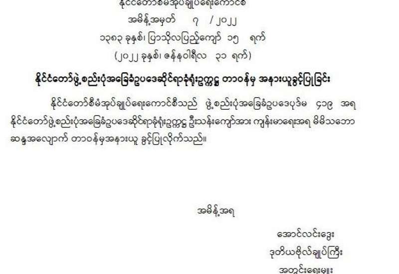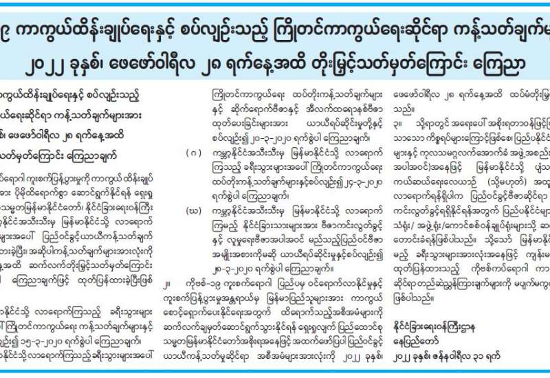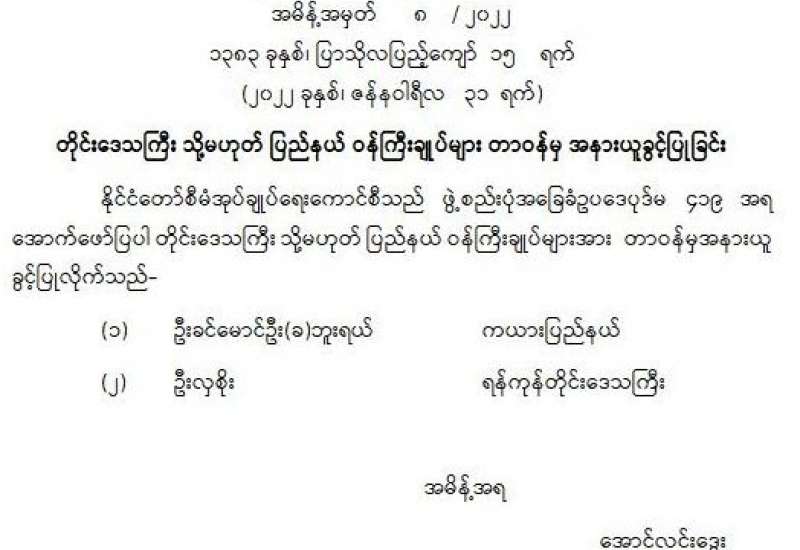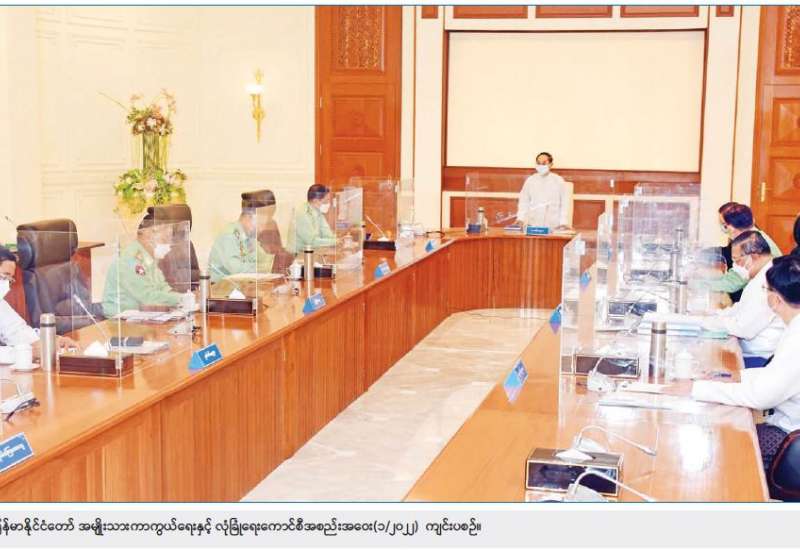 ၁။ အမျိုးသားကာကွယ်ရေးနှင့်လုံခြုံရေးကောင်စီ အစည်းအဝေးကို အမျိုးသား ကာကွယ်ရေးနှင့် လုံခြုံရေးကောင်စီ အစည်းအဝေးခန်းမ၌ ယနေ့နံနက် ၀၉၃၀ နာရီတွင် ကျင်းပပြုလုပ်ခဲ့သည်။ အစည်းအဝေးတွင် တပ်မတော်ကာကွယ်ရေးဦးစီးချုပ်၊ ဗိုလ်ချုပ်မှူးကြီး မင်းအောင်လှိုင်က နိုင်ငံရေးအရ နိုင်ငံတစ်ဝန်းလုံး အရေးပေါ်အခြေအနေကြေညာပြီးနောက် နိုင်ငံရေး၊ စီးပွားရေး၊ လူမှုရေးဖြစ်ပေါ်တိုးတက်မှု အခြေအနေများ၊ နိုင်ငံတော်တည်ငြိမ်ရေးနှင့် ရပ်ရွာ အေးချမ်း သာယာရေးတို့ကို အလေးထားဆောင်ရွက်ခဲ့သည့် အခြေအနေများ၊ ဖြစ်ပေါ်နေသည့် အခြေအနေ များကို ခြုံငုံသုံးသပ်မှုများအရ ပြည်တွင်းပြည်ပ အဖျက်သမားများနှင့် ၎င်းတို့ကို အားပေးနေသည့် လူပုဂ္ဂိုလ်များ၊ အဖွဲ့အစည်းများ၏ လိုလားချက်သည် ဒီမိုကရေစီထက် အလုံးစုံပျက်သုဉ်းရေးကို ဦးတည်ဆောင်ရွက်နေသည့် အခြေအနေများနှင့် လက်ရှိအခြေအနေ တွင် ချင်းပြည်နယ်နှင့် စစ်ကိုင်းတိုင်းဒေသကြီး အချို့တို့၌ အကြမ်းဖက် တိုက်ခိုက်မှုများ၊ ဖျက်ဆီးမှုများရှိနေသကဲ့သို့ နိုင်ငံအတွင်း မြို့နယ်အချို့တွင် ရပ်ကွက်နှင့် ကျေးရွာအုပ်ချုပ် ရေးမှူးများ ခန့်ထားရန် ကျန်ရှိနေသေးသည့် အခြေအနေများကြောင့် စစ်မှန်၍စည်းကမ်း ပြည့်ဝသော ပါတီစုံဒီမိုကရေစီစနစ်လမ်းကြောင်းပေါ် ပြန်လည်ရောက်ရှိနိုင်ရေးနှင့် ပြည်ထောင်စုသမ္မတ မြန်မာနိုင်ငံတော် ဖွဲ့စည်းပုံအခြေခံဥပဒေ (၂၀၀၈ ခုနှစ်) ပုဒ်မ ၄၂၉ အရ ပါတီစုံဒီမိုကရေစီ အထွေထွေရွေးကောက်ပွဲကို ကျင်းပပေးနိုင်ရေးတို့အတွက် ဆက်လက် ဆောင်ရွက်ပေးရန် လိုအပ်လျက်ရှိပါသဖြင့် နိုင်ငံတစ်ဝန်းလုံး အရေးပေါ်အခြေအနေ ကြေညာထားသည့်ကာလအား သက်တမ်းတိုးမြှင့်ပေးပါရန် ဖွဲ့စည်းပုံအခြေခံ ဥပဒေ (၂၀၀၈ ခုနှစ်) ပုဒ်မ ၄၂၅ အရ တင်ပြခဲ့သည်။